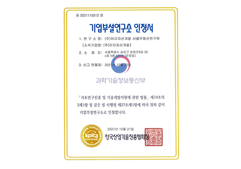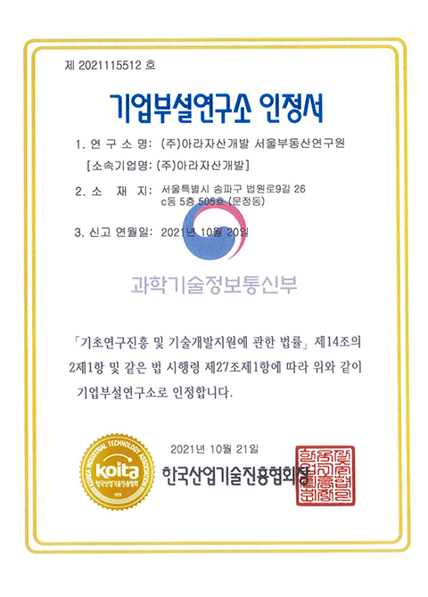 Inside (주)아라자산개발 서울부동산연구원 설립 (기업부설연구소) 2021-10-21 (주)아라자산개발 기업부설연구소인 서울부동산연구원이 10월 21일 설립 인정을 받았습니다. 설립을 축하드립니다. 연구소명 : (주)아라자산개발 서울부동산연구원 연구원장 : 노태욱원장 chevron_left PREV menu LIST NEXT chevron_right