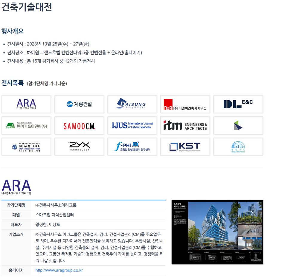 대한민국 건축산업의 발전을 선도하는 기업의 축적된 기술 등 우수한 건축기술을 전시하는 행사에
