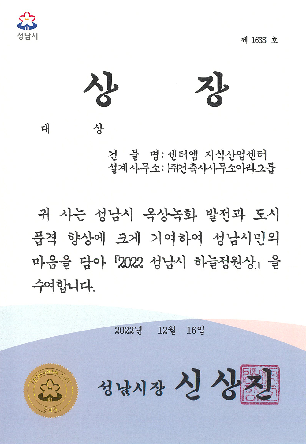 Awards 2022 성남시 하늘정원상 대상 수상 2022-12-19 금번 성남시에서 2022. 9. 6(화) ~ 2022. 9.30(금) 공모한 옥상녹화 우수건축물 공모인 [2022 성남시 하늘정원상]에서 당사에서 설계한 센터엠 지식산업센터가 대상을 수상하였습니다. 대상 수상에 진심으로 축하를 드리며 작업하신 모든 직원분들 수고하셨습니다. chevron_left PREV menu LIST NEXT chevron_right