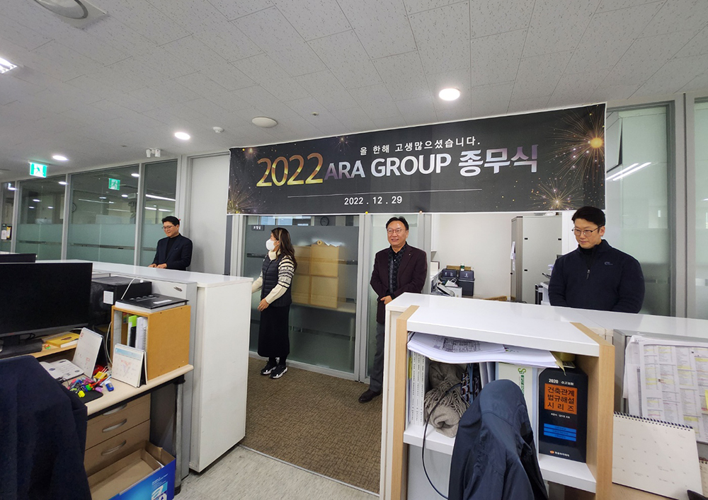 2022년 ARA GROUP 종무식 다사다난했던 2022년 임인년 검은호랑이의 해가 저물었습니다. 2022년은 어느 해 보다도 모든 임직원들이 치열하게 지내온 한 해 였던것 같습니다. 임직원 여러분 한 해 동안 수고많으셨습니다. 다가오는 2023년에도 힘내시길 바라겠습니다. 가정과 직장에 항상 건강과 행복이 함께 하시길 기원합니다.