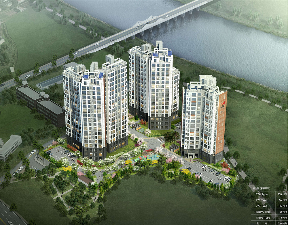 사업주체 : (주)레드씨플래닝, 에스엠상선(주) 설계자 : (주)에이건축사사무소 시공사 : 우방산업(주), 에스엠상선(주) 위 치 : 경기도 양평군 강상면 병산리 24-1 일원 대지면적 : 11,359.40㎡ (3,436.22평) 연면적 : 32,032.32㎡ (9,689.78평) 규 모 : 지하2층, 지상18층 용 도 : 공동주택 3개동 및 부대복리시설, 근린생활시설 등 공사기간 : 총 29개월