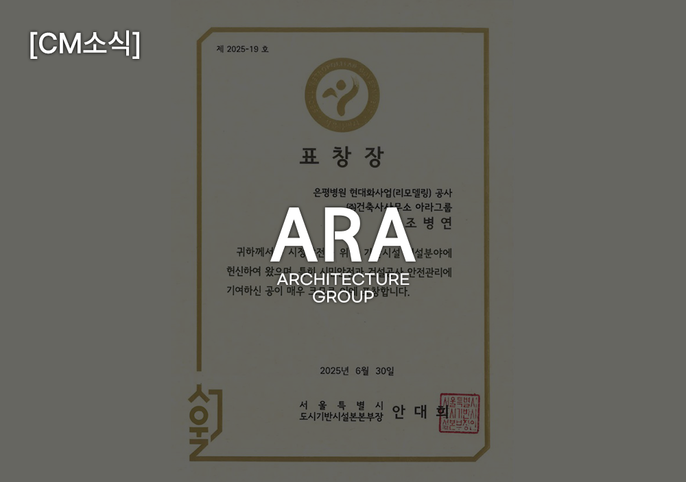 Awards 서울특별시 현장관리 우수 현장 선정 2025-07-22 은평병원 현대화사업(리모델링) 공사 현장이 서울특별시 현장관리 우수 현장으로 선정되었습니다. 2025년 상반기 현장관리 실태 종합평가에서 "안전도시 서울" 브랜드 정착에 기여한 공이 지대하기에 현장관리 우수 현장으로 인증되어 김기인 단장님, 조병연 상무님이 서울시로 부터 상훈을 받았습니다. 은평병원 프로젝트 현장 기술인 분들의 노고에 감사드리며 수상을 축하 드립니다. chevron_left PREV menu LIST NEXT chevron_right